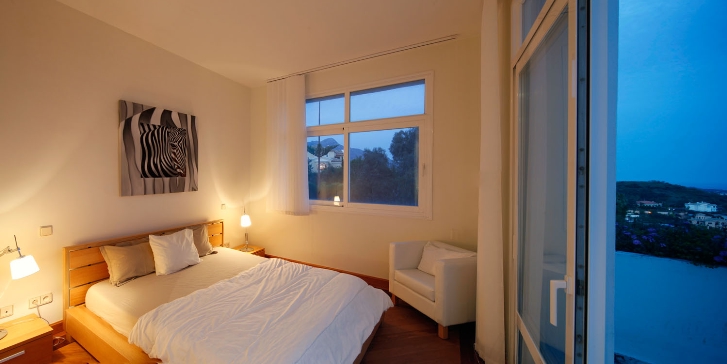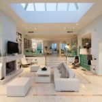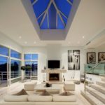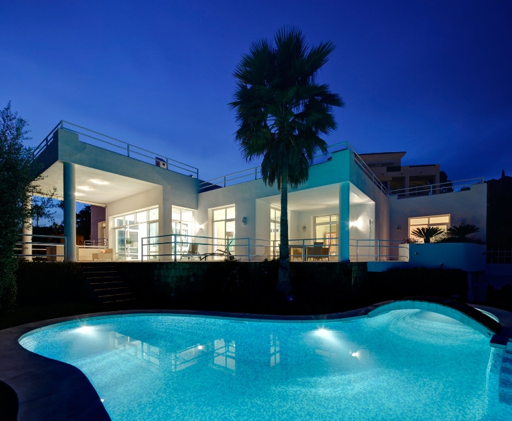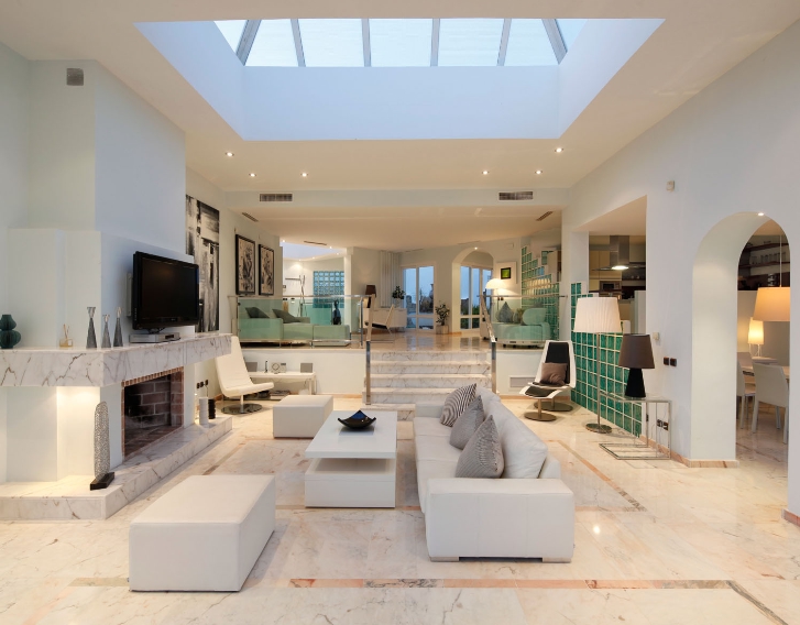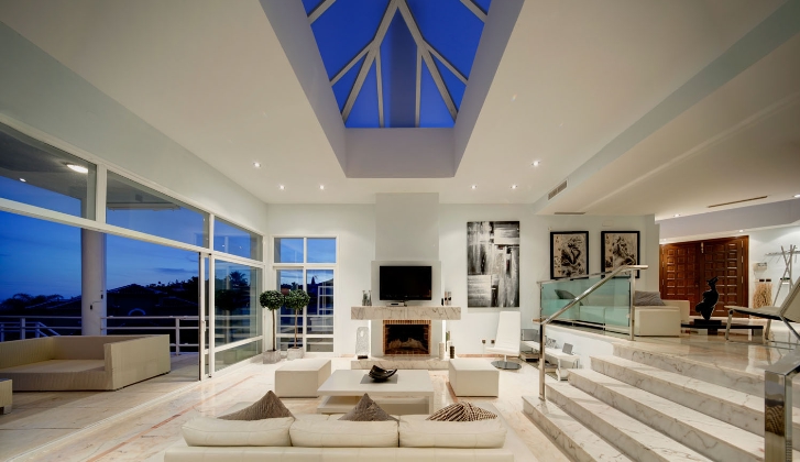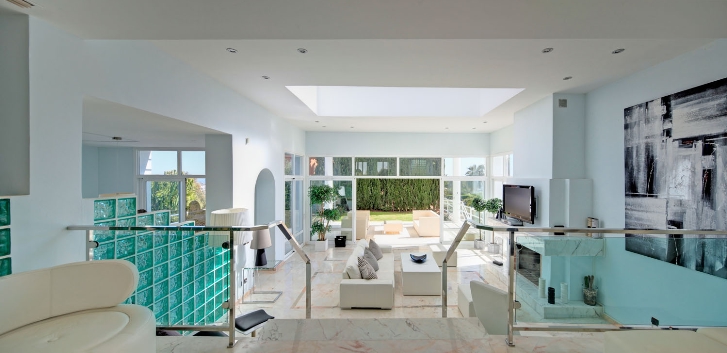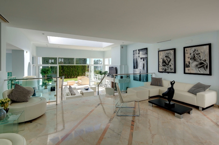 Portuguese marble entrance hall leads to a modern ´split-level´ living room which is flooded with light and offers amazing panoramic views from every angle. The lower living room features a designer skylight, chrome split balustrades, various light features and a large fireplace. On the left of the living area a fully equipped SieMatic centre-island kitchen overlooks the separated dining area which gives way to one of the many terraces that surround the house with all day sun.