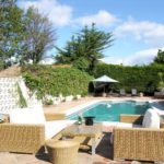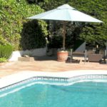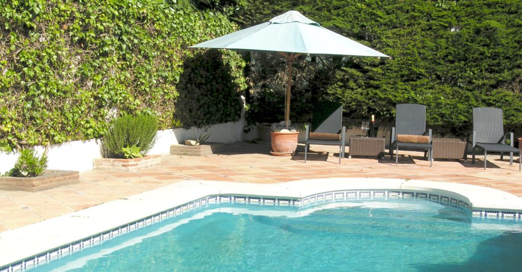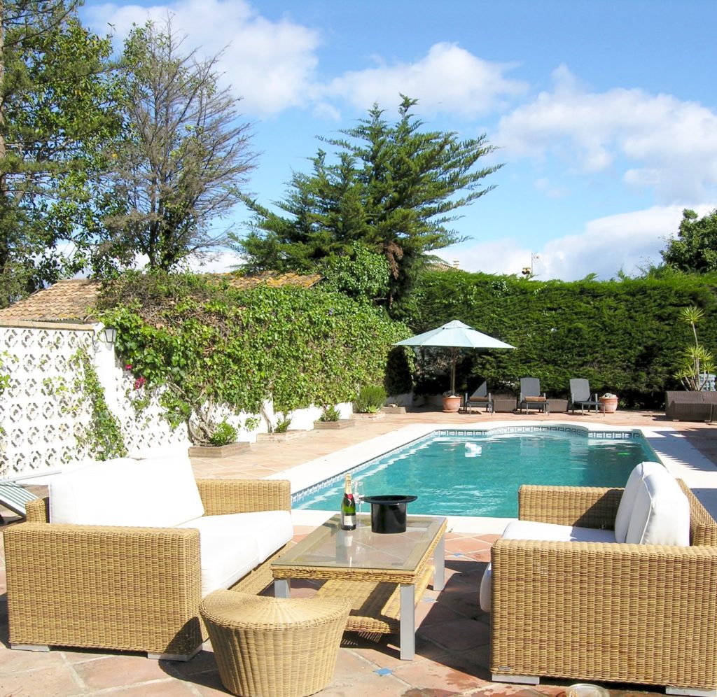 Large south facing pool with large terraces and lawned garden